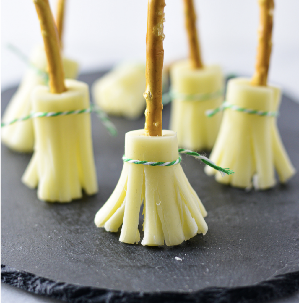 - Witch’s broom snacks (pretzel stick handle, string cheese bristles tied with chive)