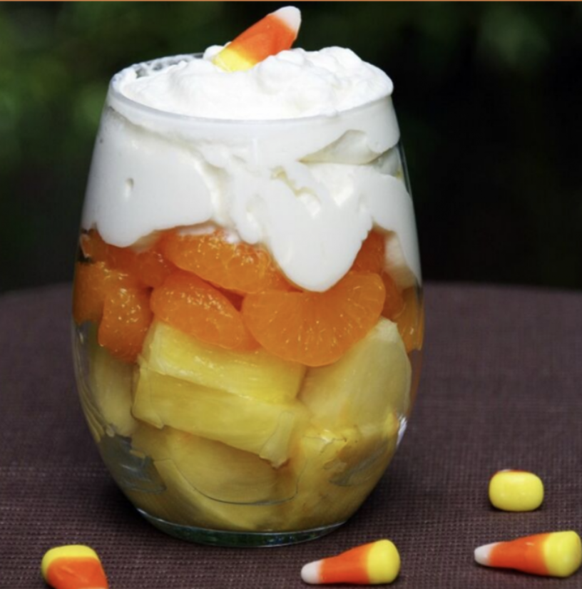 Layer pineapple chunks and mandarin oranges and top with yogurt and candy corn.