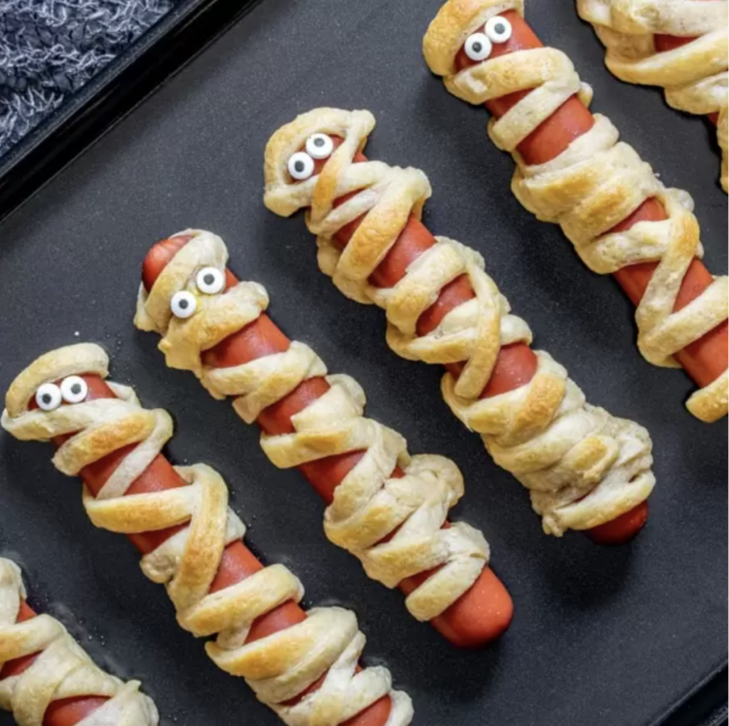 - Mummy hot dogs (crescent roll-wrapped hot dogs with “eyes” made of candy)