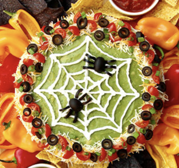 - Spider web taco dip (layer dip topped with sour cream “web” and olive “spiders”)