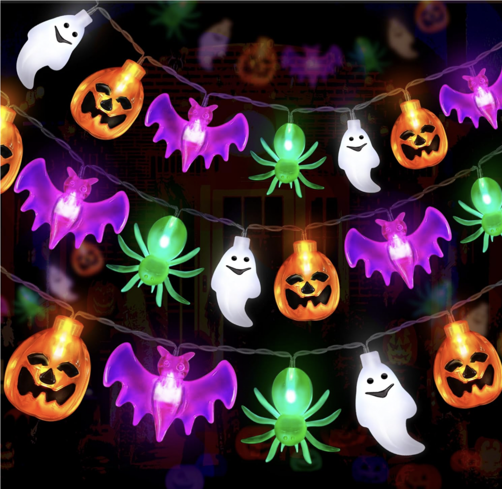 - Lighting: Orange & purple string lights, flickering flameless candles, glow-in-the-dark window decals.