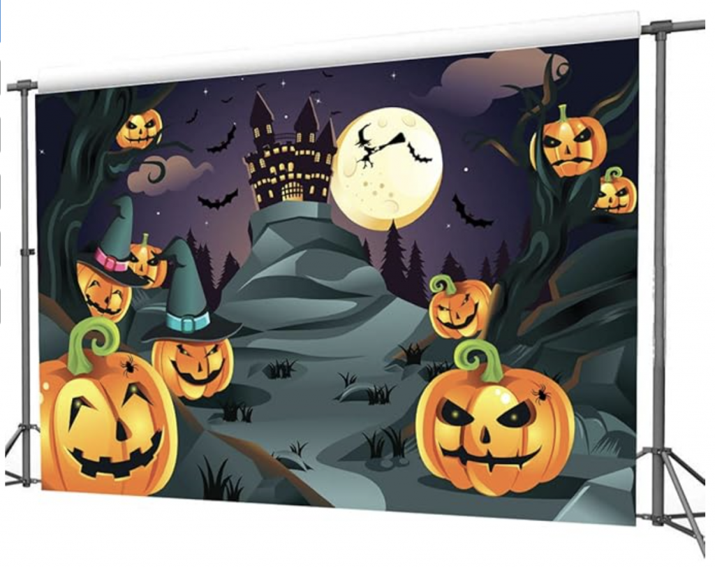 - Photo Spot: Black backdrop with cobwebs, paper bats, and props (witch hats, vampire capes, pumpkin glasses). Or you can purchase a pre-made Halloween backdrop below.