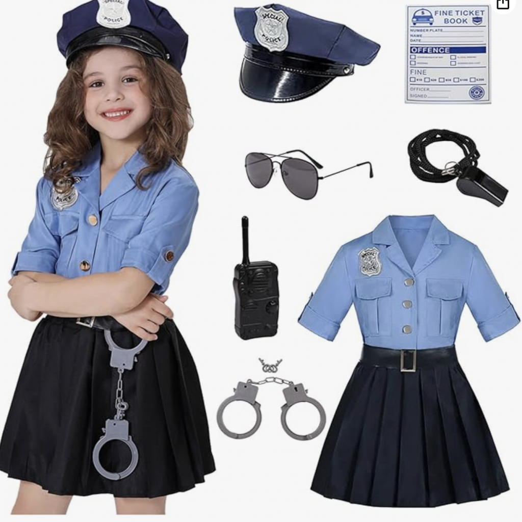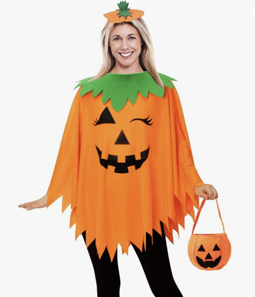 The costume includes pumpkin poncho with headband & bag. It’s a cutie!