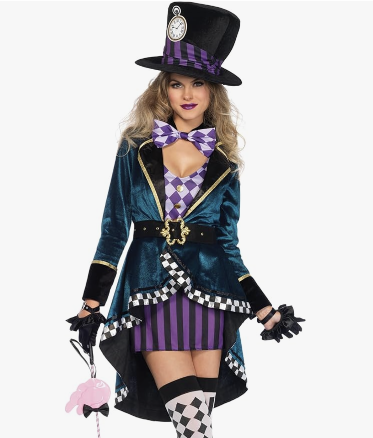 This mad look includes a printed tank dress, velvet high/low jacket, ornate buckle belt, bow tie & oversized hat.