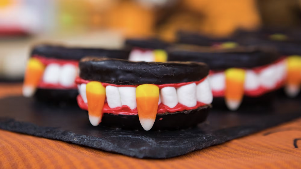 Slice chocolate-covered doughnuts and decorate with marshmallows and candy corn. Don’t skip out on the red buttercream for an even more dramatic flair!