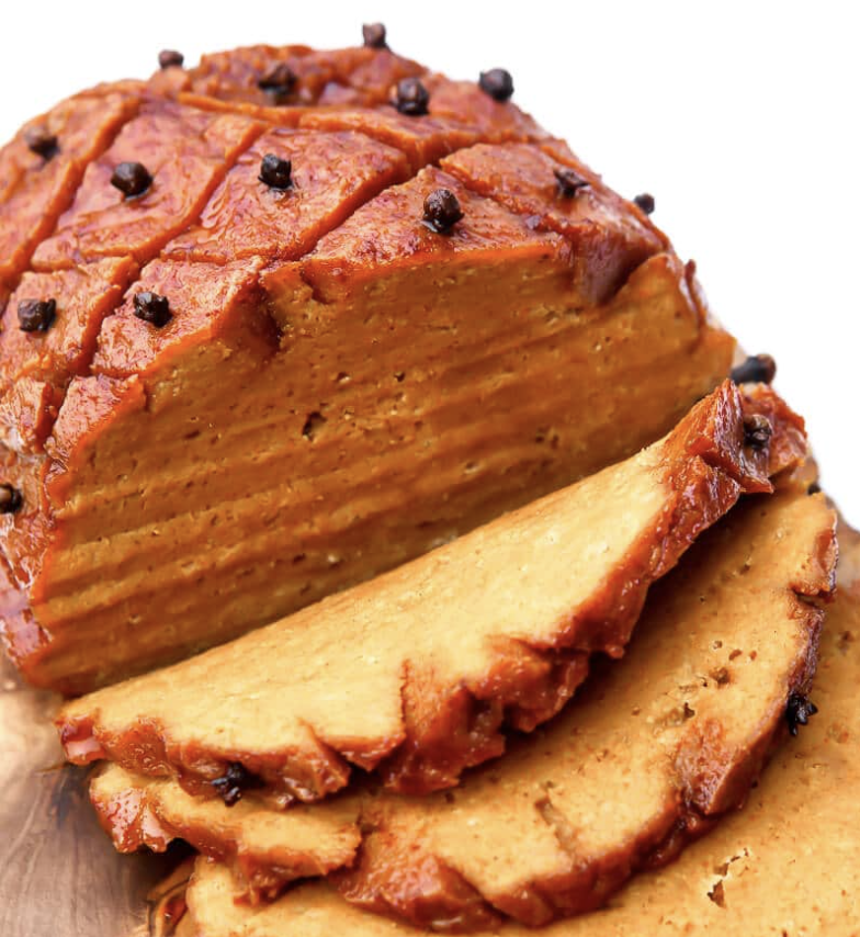 This plant-based “ham” roast has a rich, savory base and a sweet maple-pineapple glaze that caramelizes beautifully in the oven. It’s hearty, sliceable, and incredibly festive.